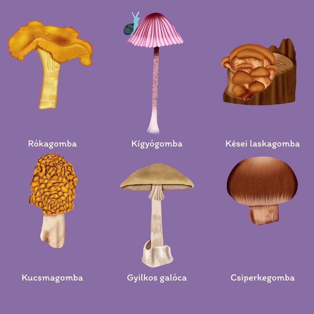 | Gomba | Rókagomba, Kígyógomba, Kései laskagomba, Kucsmagomba, Gyilkos galóca, Csiperkegomba |