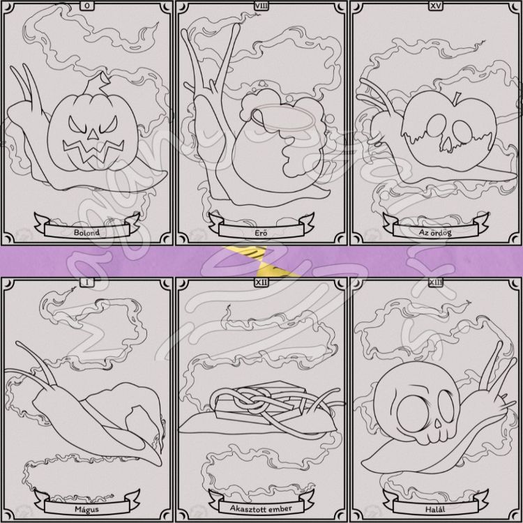 - 1 db 6 oldalas pdf, amely mindegyik őszi tarot csiga színezhető változatát tartalmazza